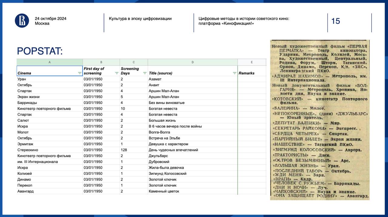 В рамках секции «Память о советском в цифровую эпоху» состоялся доклад Кристины Танис «Цифровые методы в истории советского кино: платформа "Кинофикация!"». Выступление было посвящено возможностям и границам цифровых исследований в области изучения истории советского кино. В частности, в докладе рассматривалось как цифровой поворот корректирует устоявшиеся нарративы в историографии советского кинематографа. В дополнение была представлена платформа «Кинофикация!», реализованная в рамках проекта № 24-28-01068 за счет гранта Российского научного фонда. Презентация платформы была осуществлена путем помещения советского кейса в более широкие процессы цифровизации гуманитарных наук, а также в сравнении с аналогичными кейсами, реализуемыми в Бельгии, Нидерландах, Великобритании и Чехии.